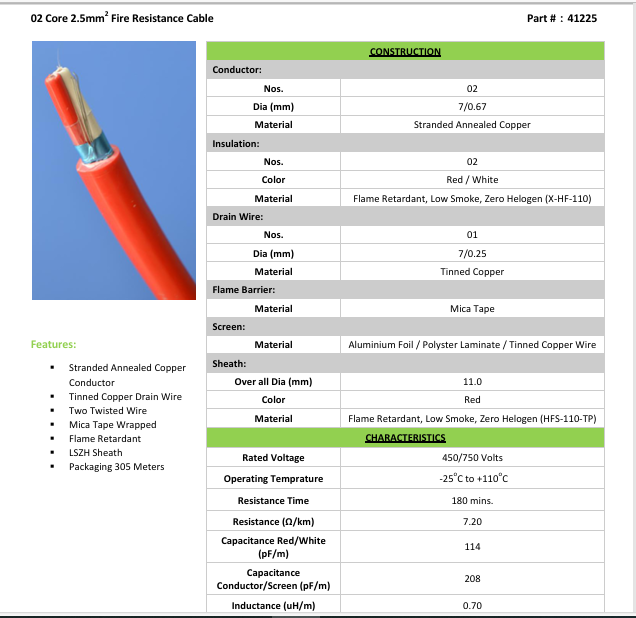 02 Core 2.5mm2 Fire Retardant Cable PONY @ 1700/meter